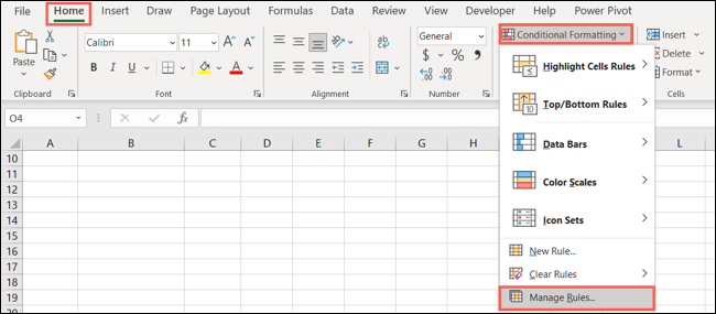 转到“主页”选项卡,单击“条件格式”下拉箭头,然后选择“管理规则”。