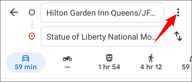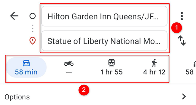 在地图屏幕的顶部,键入您想要获取路线的源位置和目标位置。然后选择前往目的地的首选方式(驾车或公共交通工具)。