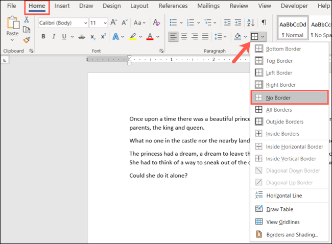 如果您稍后决定删除已添加的边框,则只需单击几下。选择包含边框的文本或段落,然后重新访问“主页”选项卡。单击边框旁边的下拉箭头,然后选择“无边框”。