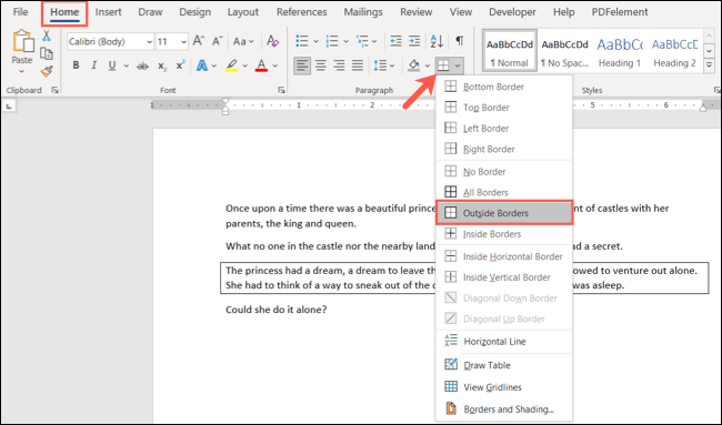 选择要用边框包围的段落,然后转到“主页”选项卡。单击边框下拉箭头并选择快速边框选项之一,例如外边框或所有边框。