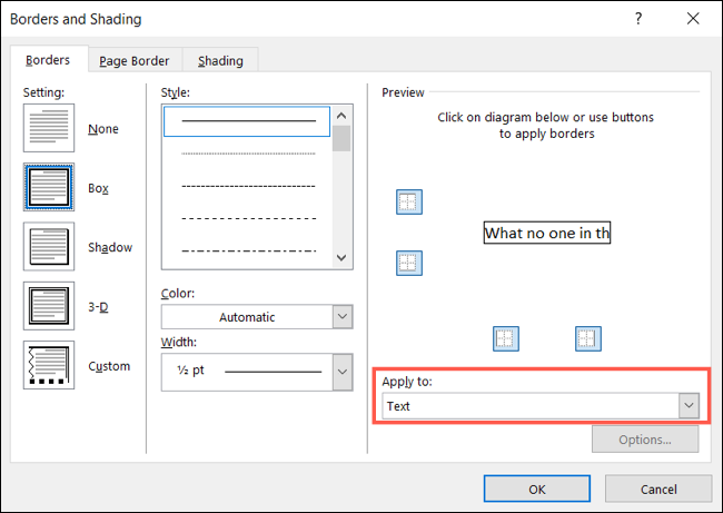 与自定义特定文本的边框一样,您可以更改边框线的样式、颜色和宽度。确认在“应用于”下拉框中选择了“段落”。然后,要调整间距,请单击窗口右侧的“选项”。