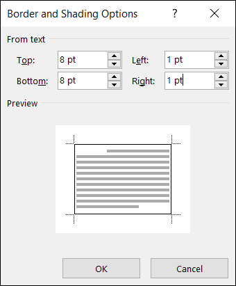 在顶部,使用箭头或输入与文本相关的边框顶部、底部、左侧和右侧的间距的点数。进行更改时,您将在下方直接看到预览。完成后单击“确定”。