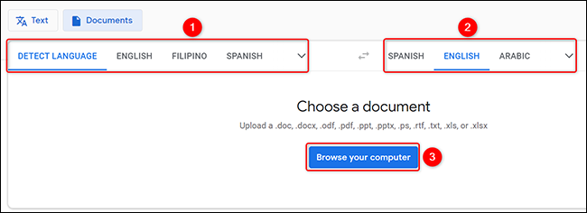 在右侧的窗格中,选择要将 PDF 翻译成的语言。然后,在中间,单击“浏览您的计算机”以将您的 PDF 上传到该站点。