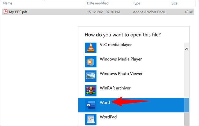 找到 PDF 后,右键单击它并选择“打开方式”>“Word”。这将在 Word 应用程序中打开您的 PDF。
