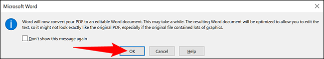 当 Word 打开时,您将看到一条消息,指出可能不会保留 PDF 的原始格式。要继续,请在提示中单击“确定”。