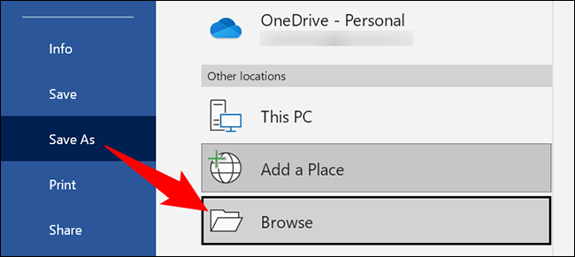 在左侧边栏中,单击“另存为”。然后,从右窗格中,选择“浏览”。