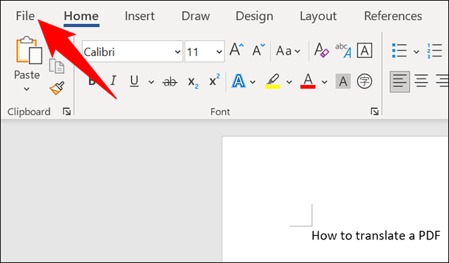 要将 PDF 翻译成另一种语言,您必须先将其转换为 Word 格式 DOCX。为此,请在 Word 的左上角单击“文件”。