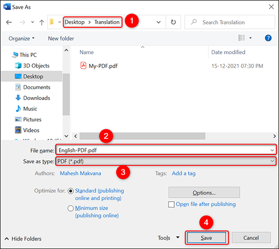 在打开的窗口中,选择一个文件夹来保存翻译后的 PDF。在“文件名”字段中输入文件的名称。单击“另存为类型”下拉菜单,然后选择“PDF”。