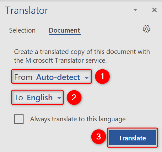 您将在 Word 屏幕的右侧看到一个“翻译器”部分。在这里,在“文档”选项卡中,使用“发件人”下拉菜单选择 PDF 的源语言。使用“收件人”下拉菜单指定目标语言。