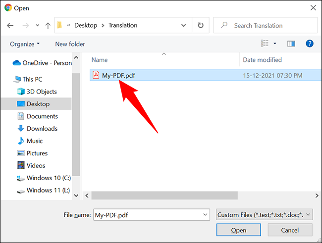 您计算机的标准“打开文件”窗口将打开。在此窗口中,导航到保存 PDF 的文件夹,然后双击 PDF 将其导入。