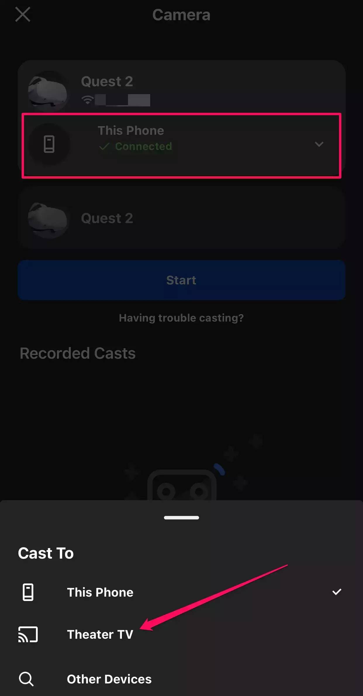 您也可以从手机上的 Oculus 应用开始投射。首先,您需要从App Store或Google Play安装 Oculus 应用,并通过登录您的 Meta (Oculus/Facebook) 帐户进行设置。