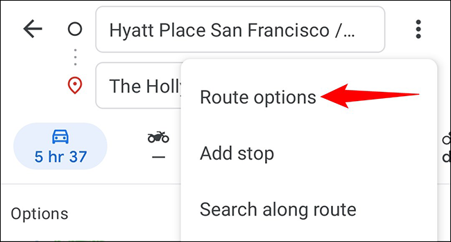 当您的路线出现时,在您指定的位置正下方,单击“选项”。
