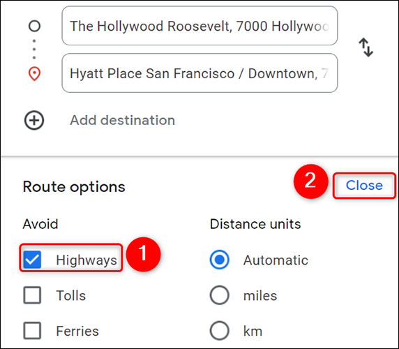 在打开的“Route Options”部分中,从“Avoid”部分激活“Highways”选项。然后点击“关闭”。