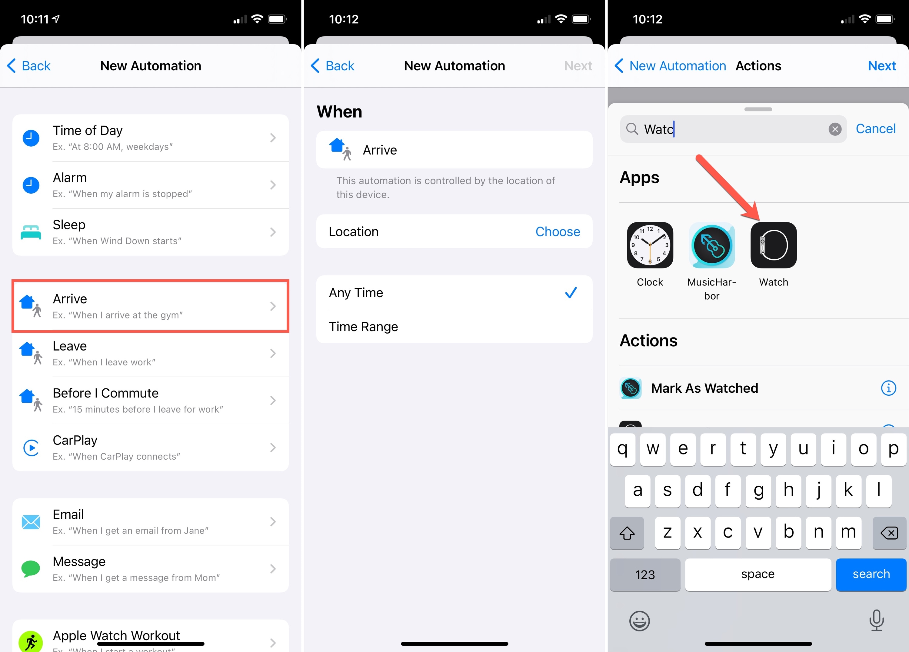 要在Apple Watch上设置剧院模式自动化,请打开“快捷方式”应用程序,然后执行以下步骤。