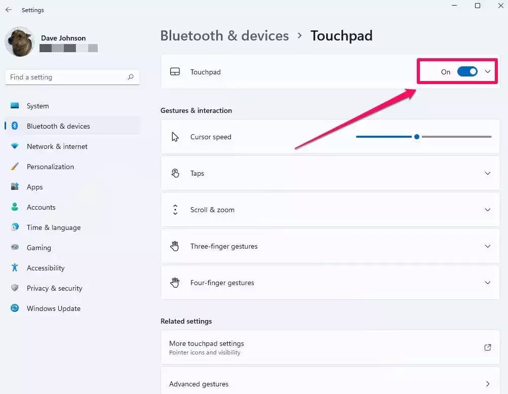 触摸板也可能在设置中被禁用。要在 Windows 中进行检查,请单击Start,然后单击Settings。单击蓝牙和设备,然后单击触摸板。通过向右滑动按钮,确保触摸板已打开。如果触摸板已启用但行为异常,您还可以探索此页面上的其他选项以确保触摸板没有配置错误。