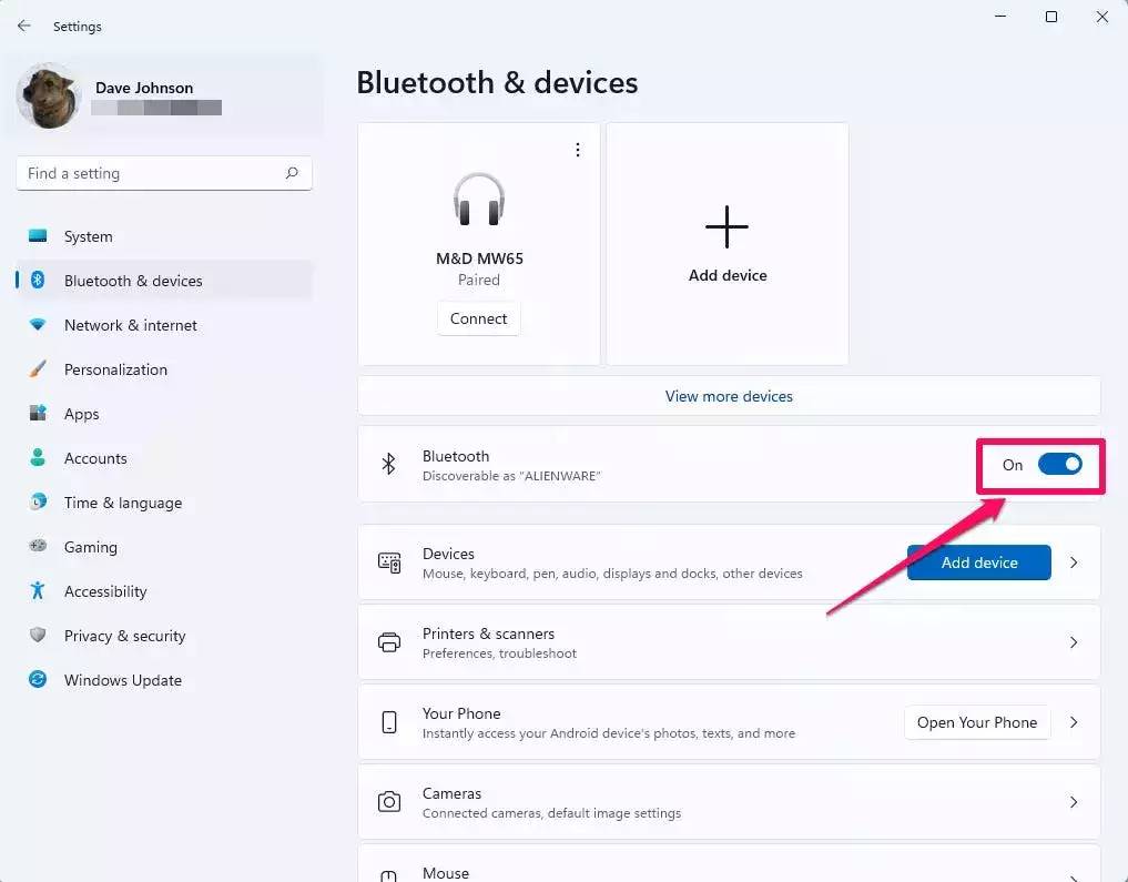 - 在 Windows 中,单击开始,然后单击设置,然后单击蓝牙和设备。最后,通过向左滑动按钮关闭蓝牙。