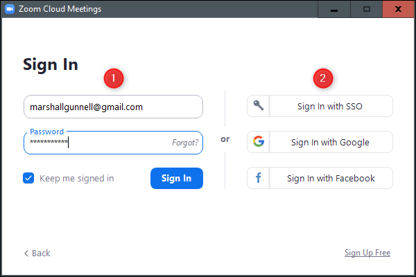 打开 Zoom,系统会提示您登录。您可以输入您的电子邮件和密码,然后选择“登录”,或使用SSO、Google 或 Facebook 登录。选择 Google 或 Facebook 会将您带到其各自的登录页面。如果您决定使用 SSO 登录,则需要知道公司 URL,通常是 <companyname>.zoom.us。