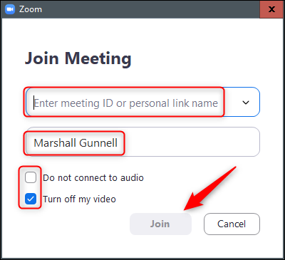 将出现一个新窗口。在第一个框中,输入您通过电子邮件收到邀请时发送给您的会议 ID。或者,如果您碰巧知道,您可以输入个人链接名称。