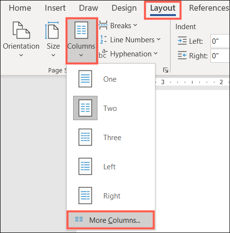 将光标放在一列中,然后转到“布局”选项卡。单击列下拉箭头并选择“更多列”。