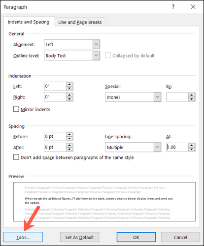 当窗口出现时,在缩进和间距选项卡上,单击左下角的“选项卡”。