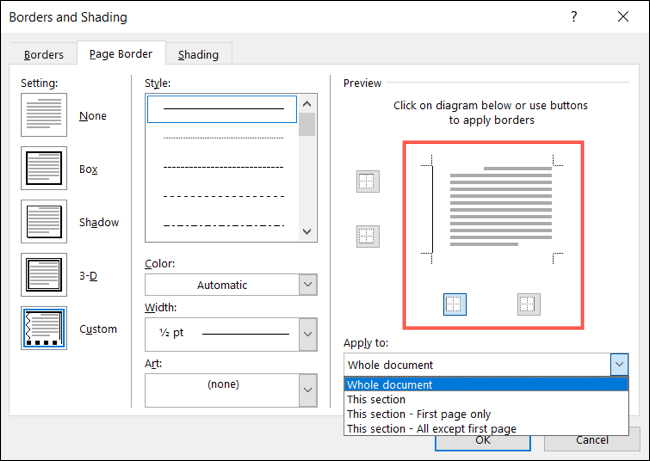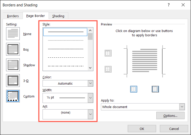 在出现的窗口中,选择顶部的页面边框选项卡。然后,使用右侧的预览工具在页面的左侧、右侧或两侧添加垂直线。在右下角,您可以使用“应用到”下拉框来选择是否要在整个文档或特定部分中使用该行。