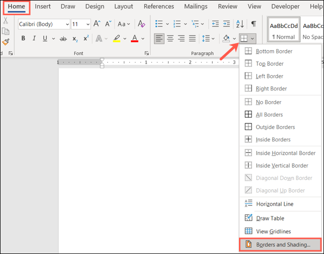 转到“主页”选项卡,单击“边框”下拉箭头,然后选择“边框和底纹”。