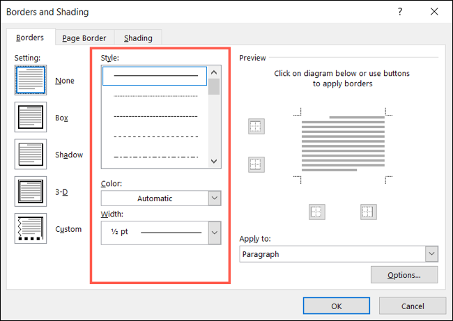 要自定义垂直线,请在“边框”下拉列表中选择“边框和底纹”。使用边框选项卡和中心部分选择要应用的样式、颜色和宽度设置。确认在窗口右下角的“应用到”下拉框中选择了“段落”。单击“确定”以应用更改。