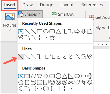打开插入选项卡,单击形状下拉箭头,然后在线条部分中选择线条。