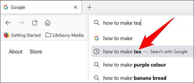 单击地址栏并开始输入您的查询。然后,使用键盘的向下和向上箭头键选择要删除的建议。