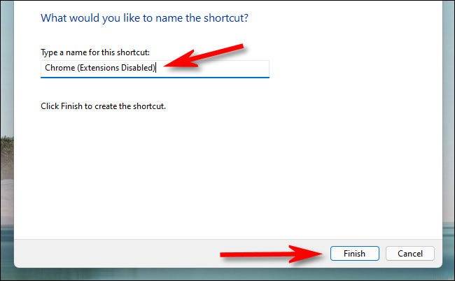 在下一页上,使用文本框将快捷方式命名为“Chrome (Extensions Disabled)”或一些令人难忘的名称,以提醒您这是一个特殊的快捷方式。然后点击“完成”。