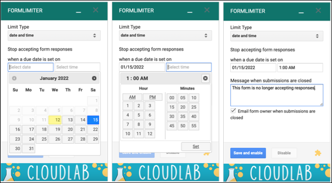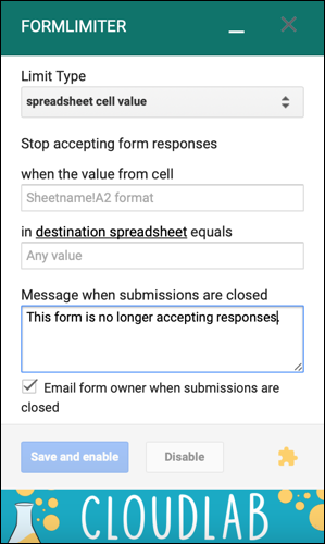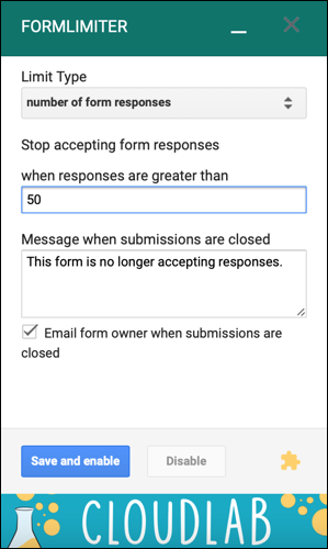 使用formLimiter插件,您可以根据响应数、日期和时间或连接的电子表格中的单元格值关闭表单。