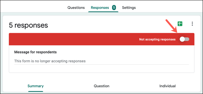 在Google 表单中打开您的表单,然后转到顶部的“回复”选项卡。关闭接受响应的开关。