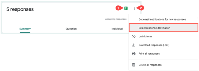 您可以通过使用 Google 表格图标创建新表格或单击三个点并选择“选择响应目标”在“响应”选项卡上执行此操作。