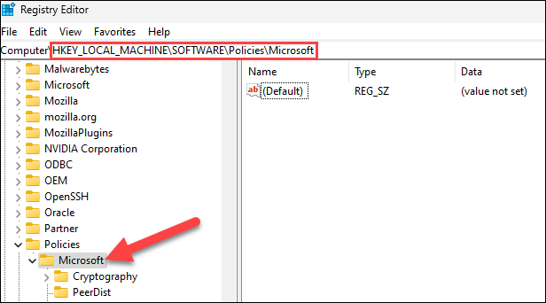 接下来,导航到左侧边栏中。HKEY_LOCAL_MACHINE\SOFTWARE\Policies\Microsoft