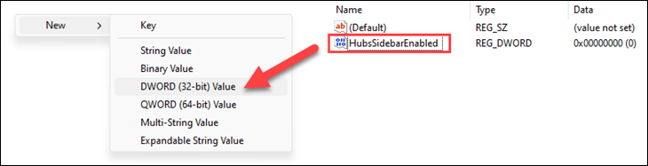 现在,在您刚刚创建的“边缘”子文件夹中,右键单击并选择新建> DWORD。将其命名为“HubsSidebarEnabled”。