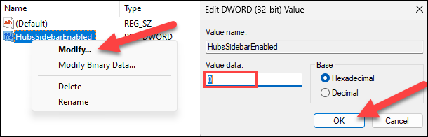 右键单击“集线器侧边栏已启用”,然后选择“修改”。确保值数据设置为“0”,然后单击“确定”。