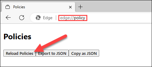 现在,打开 Microsoft Edge 并导航到 。单击“重新加载策略”。edge://policy