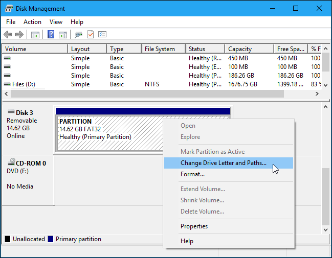 为此,请在“磁盘管理”中右键单击驱动器上的分区,然后选择“更改驱动器号和路径”。如果无法单击“更改驱动器号和路径”,那是因为Windows不支持分区上的文件系统 – 有关详细信息,请参阅下文。