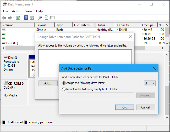 要分配驱动器号,请单击“添加”按钮,然后将您选择的驱动器号分配给驱动器。单击“确定”,它将出现在文件资源管理器或文件资源管理器中,并带有该驱动器号。