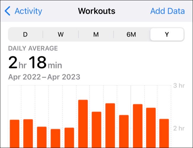 通过在iPhone上启动“健康”应用程序,然后导航到“浏览”选项卡并点击“活动”类别来手动记录锻炼。在出现的屏幕上,点击“锻炼”以显示您记录的锻炼图表。