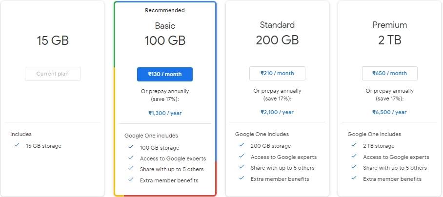 增加 Gmail 存储空间的唯一方法是购买 Google One 计划。对于所有免费帐户,额外存储计划从 100 GB 开始。Google 总共提供了三种计划来增加您的存储空间,即基本、标准和高级,分别为 100 GB、200 GB 和 2 TB。请记住,Gmail 的付费版本是 Google 的 GSuite 的一部分,其中包括其他 Google Apps。