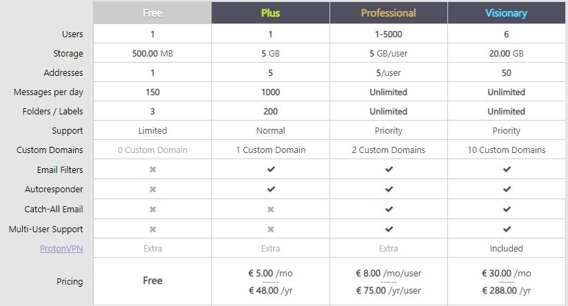 尽管 ProtonMail 的付费计划非常昂贵且存储空间较少,但每年的费用范围为 48 欧元至 288 欧元。最便宜的计划提供 5 GB 的存储空间、5 个电子邮件地址、每天 1000 条消息、200 个文件夹、带有智能过滤器的自定义域以及自动回复支持。尽管免费计划不会限制您每天收到的电子邮件数量,但如果免费计划的功能不足以满足您的需求,您将需要购买付费计划。