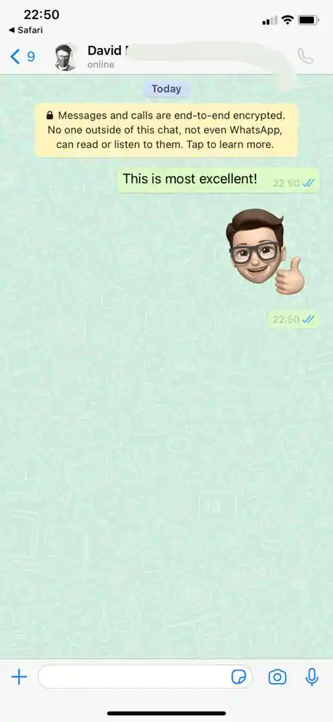 步骤4:现在,您应该看到一个常规的WhatsApp聊天窗口,但顶部带有您自己的号码(或名称,取决于您是否保存了自己的号码)。输入内容,然后点击发送。