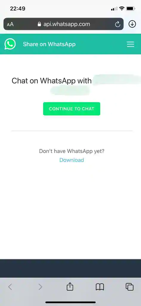 步骤3: WhatsApp现在将执行重定向到页面的页面,该页面包含一个绿色大按钮,显示“继续聊天”。点按该按钮。