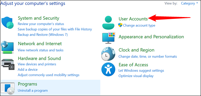 单击控制面板中的“用户帐户”。