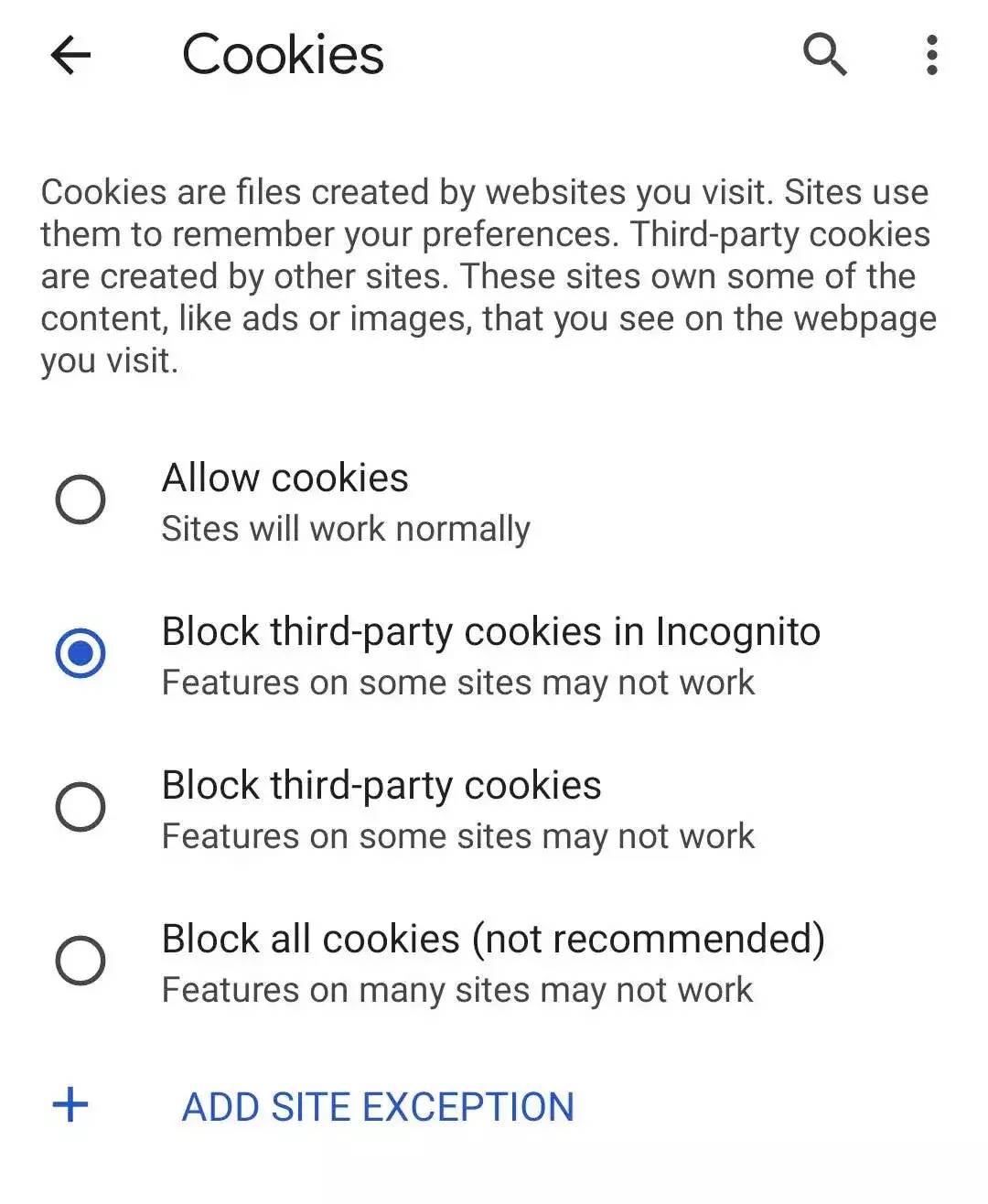 如果您不想定期删除 cookie,并且希望阻止您的 Android 设备保存新的 cookie,您可以告诉 Chrome 阻止 cookie。