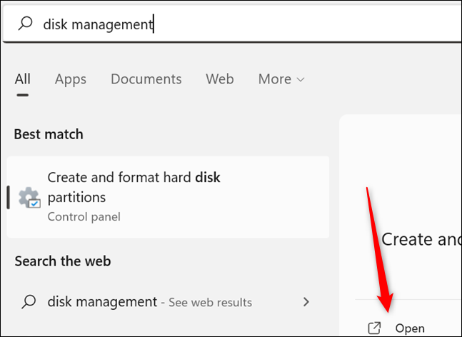 单击开始按钮,在搜索栏中键入“磁盘管理”,然后按 Enter 或单击“打开”。