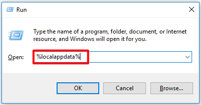 步骤1:按Windows和R键打开“运行”窗口,然后键入%localappdata%并按Enter键。