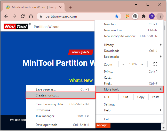 步骤2:在弹出菜单中,选择更多工具>创建快捷方式。