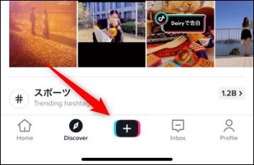 要在 TikTok 上进行直播,请在您的 iPhone 或 Android 移动设备上启动该应用程序,然后按屏幕底部中央的“加号”(+) 图标。